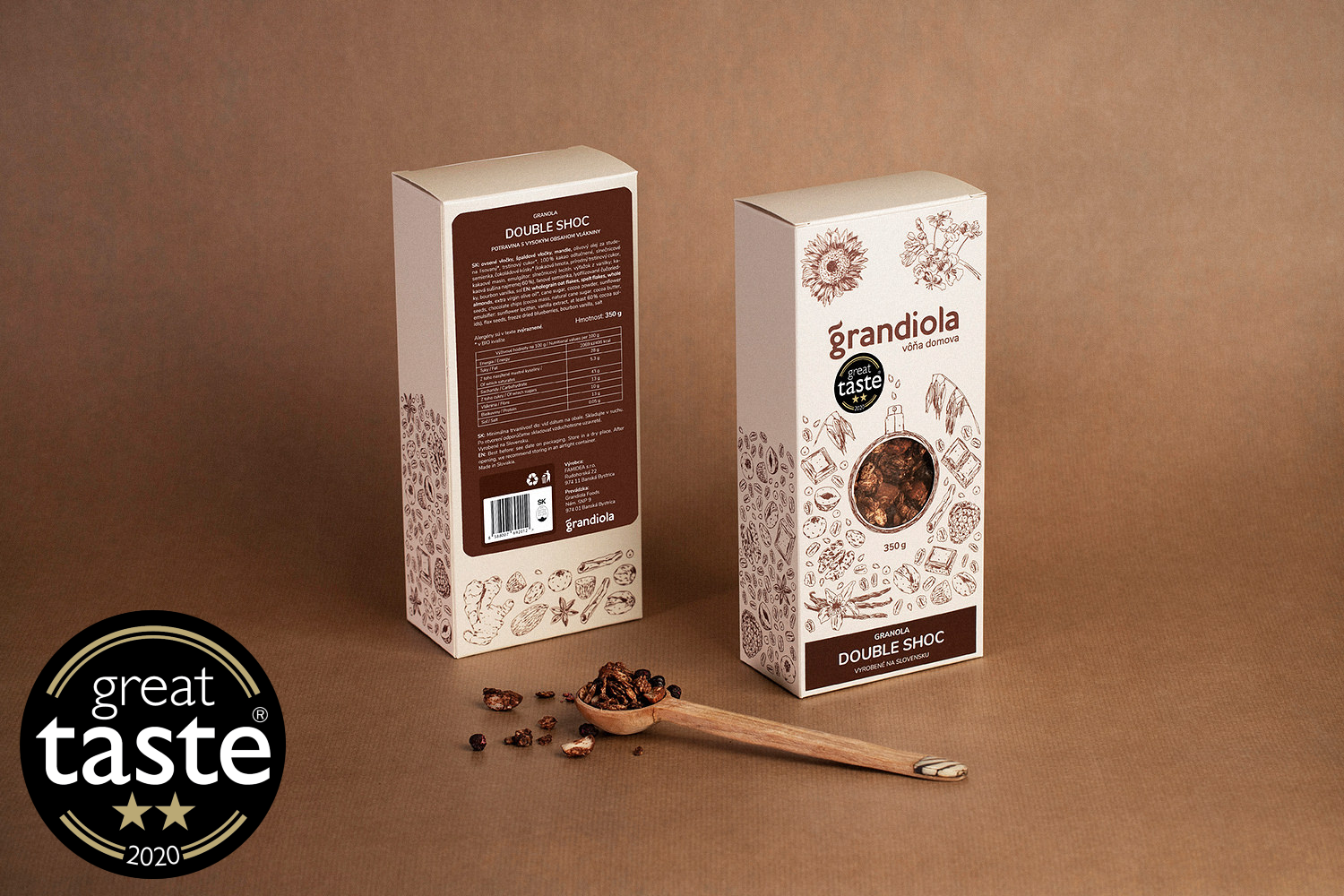 Naša granola Double Shoc a Cocoworking získala v rokoch 2020 a 2021 ocenenie z prestížnej britskej súťaže výrobcov prémiových potravín Great Taste Awards. Chuť Grandioly je teda známa už aj medzinárodne!